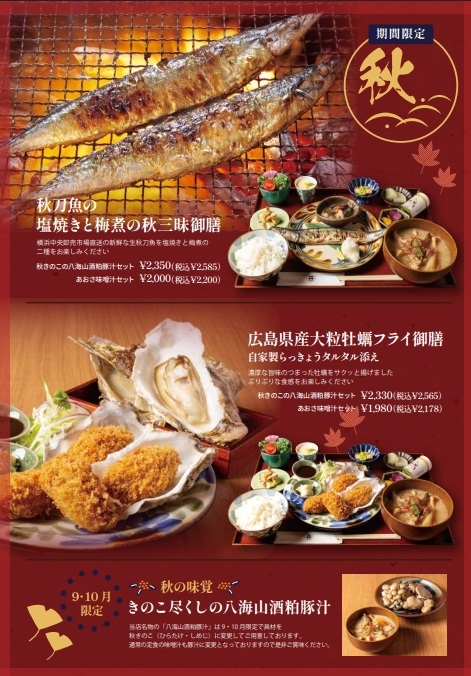 【秋刀魚の塩焼きと梅煮の秋三昧御膳】【広島県産大粒牡蠣フライ御膳】のほか、ご好評いただいている「八海山酒粕豚汁」も秋の装いで限定登場。きのこの旨みをたっぷり詰め込んだ"きのこ尽くし"の酒粕豚汁をお楽しみいただけます。
